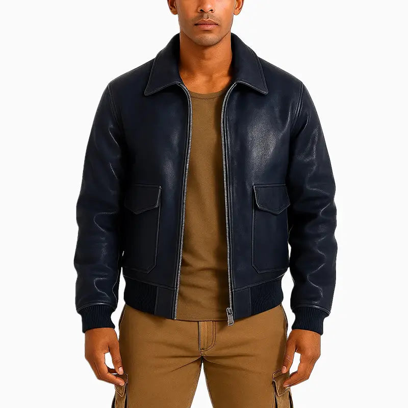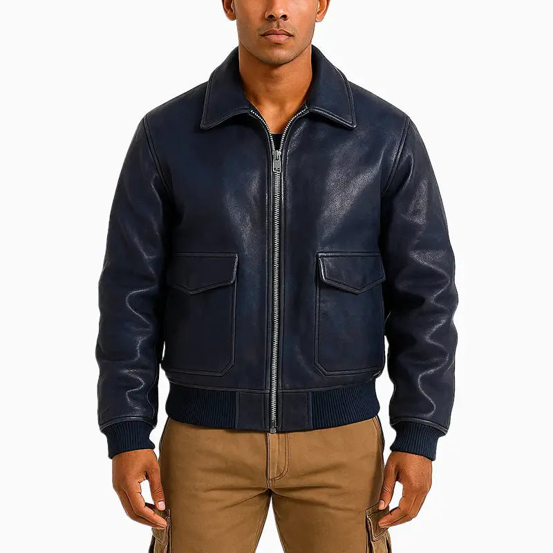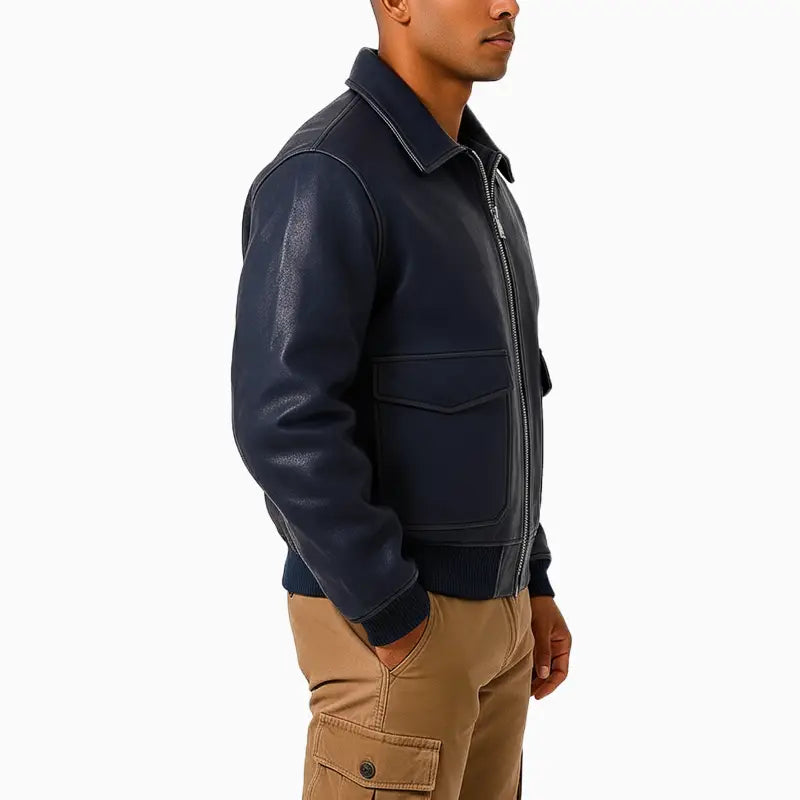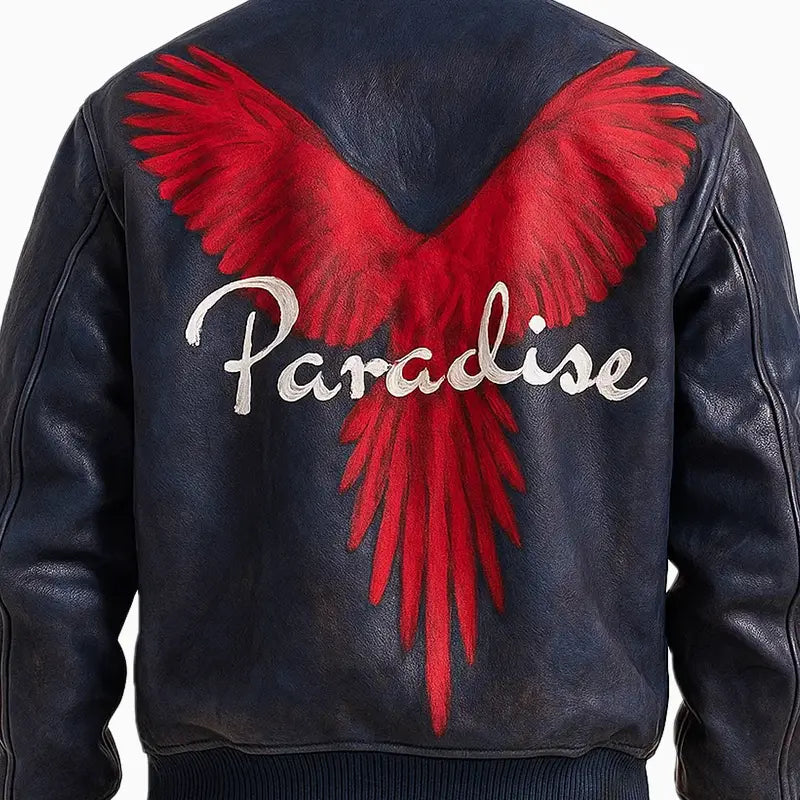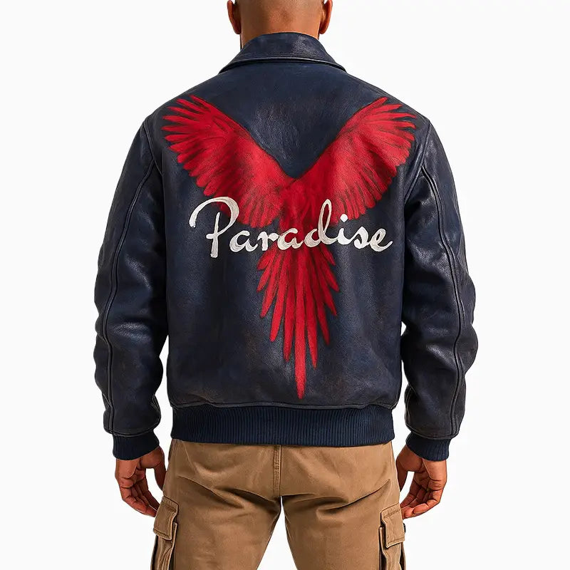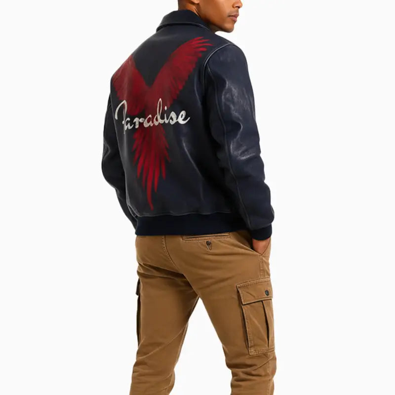 Blue Aviator Style Leather Jacket with Red Hand Painted Phoenix Art