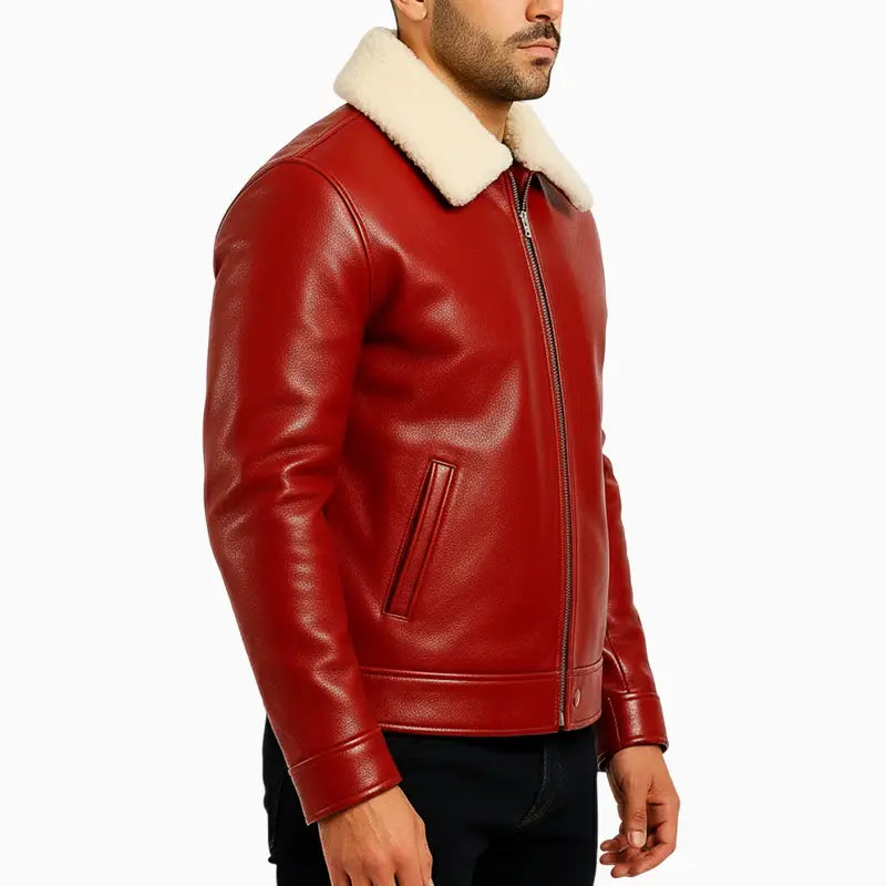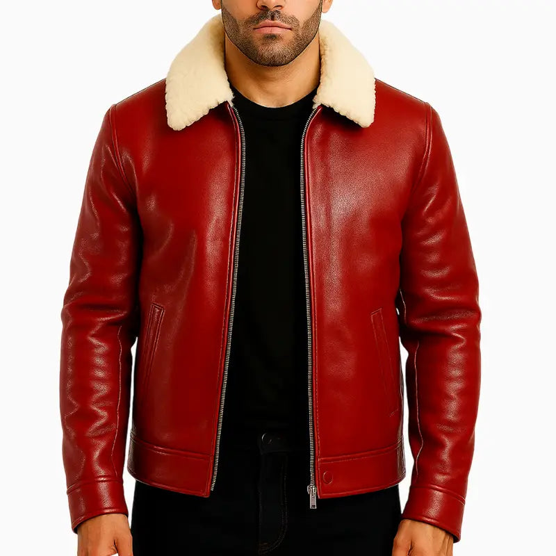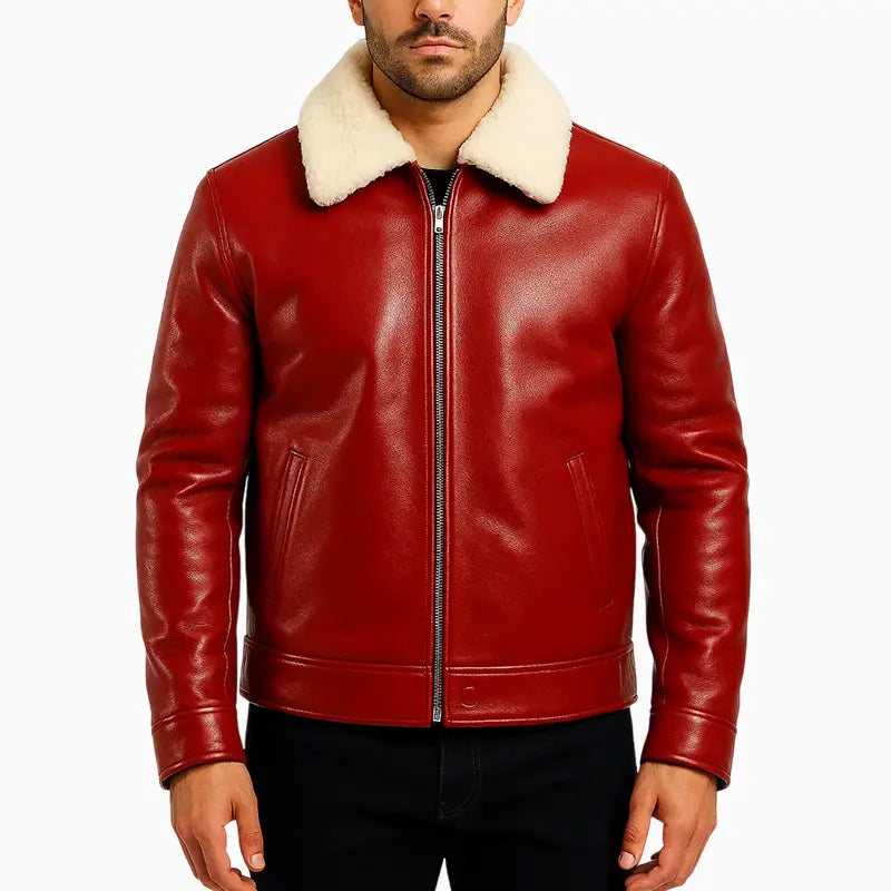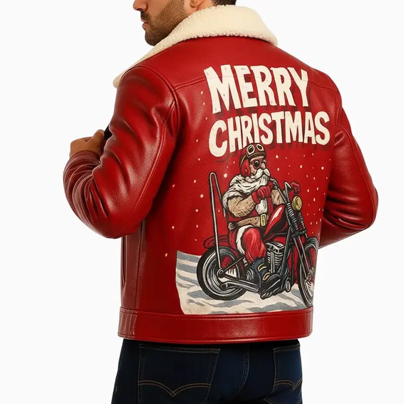 This Men’s Santa on Wheels Red Hand Painted Leather Jacket blends winter warmth with festive character in a bold and stylish way. The smooth red leather finish paired with a plush cream shearling collar brings both comfort and a classic seasonal look. Its clean front design, full zipper closure, and tailored fit make it a versatile winter piece that works effortlessly for casual outings or holiday gatherings. The back features a vibrant hand-painted Christmas artwork showcasing Santa riding a vintage motorcycle through a snowy night, with a bold “Merry Christmas” script above. This standout design adds personality, humor, and holiday spirit, turning the jacket into a statement piece for the festive season. With its mix of warmth, durability, and creative artwork, this jacket delivers a perfect blend of style and celebration.