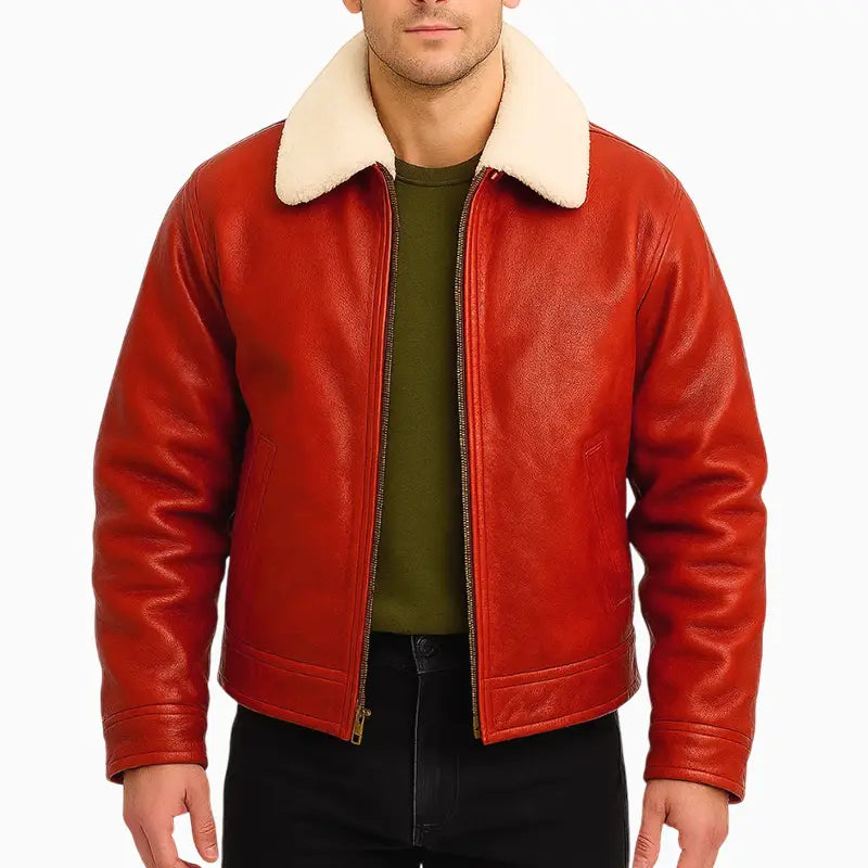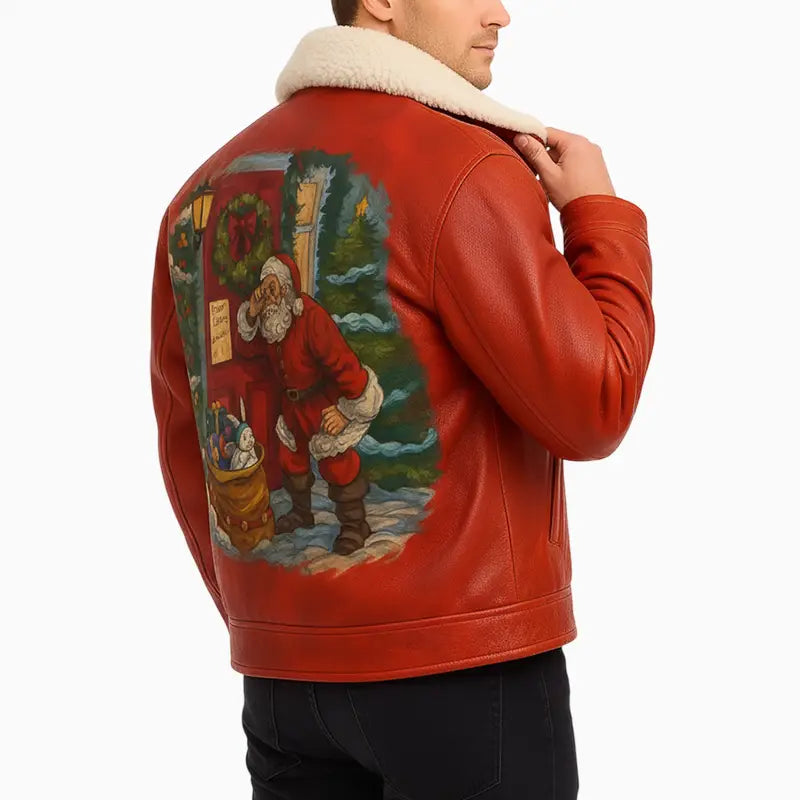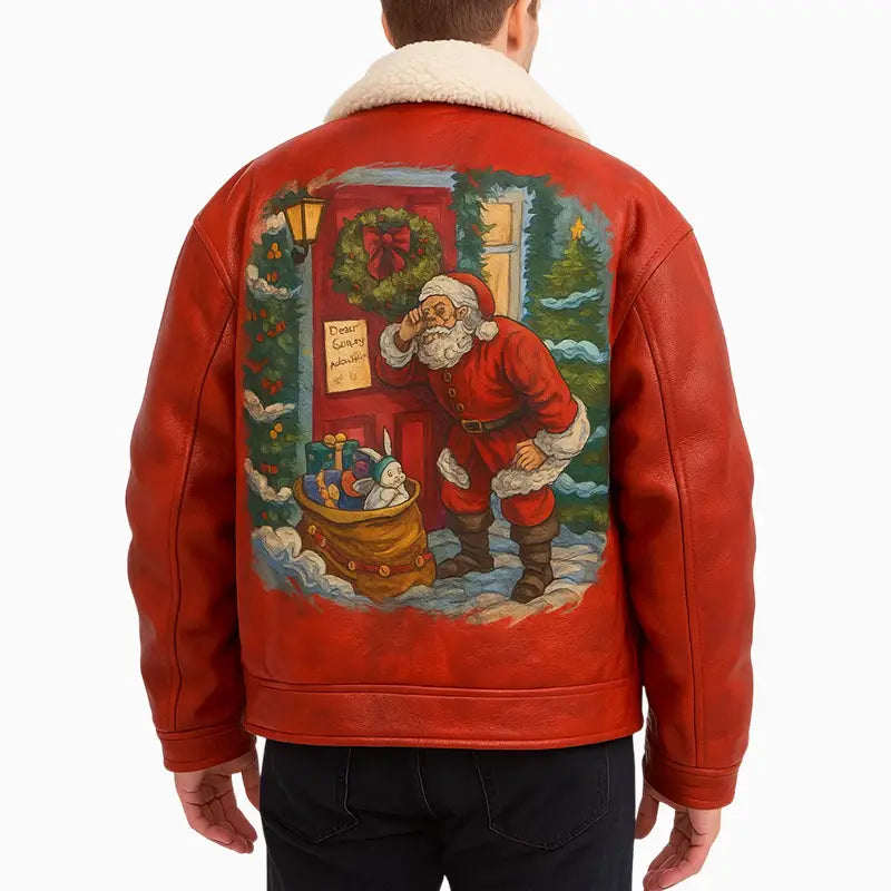 This Xmas Santa’s Hand Painted Leather Jacket brings classic winter style and festive charm together in one standout piece. The front features a clean, timeless look with a smooth finish, straight zip closure, and cozy off-white shearling collar that enhances warmth and comfort. Its sleek silhouette and premium craftsmanship make it ideal for both everyday winter wear and special seasonal outings. The back showcases a beautifully hand-painted Christmas artwork, capturing Santa standing at a decorated door with his gift sack by his side. The detailed illustration, rich colors, and warm holiday theme make this jacket a true collector’s item for anyone who loves unique seasonal fashion. Designed to feel luxurious and look exceptional, it adds holiday cheer to your wardrobe while keeping you snug through the cold months.