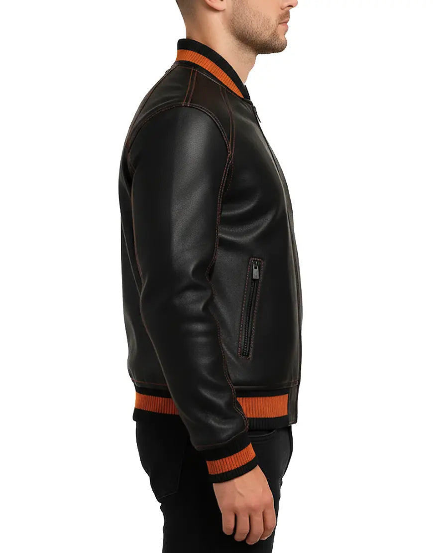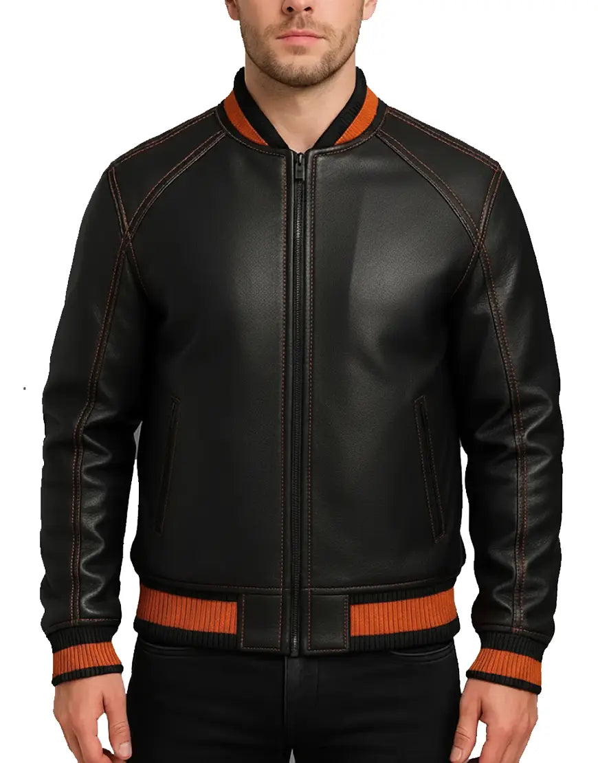Men’s Black Bomber Leather Jacket with Orange Ribbed Trims