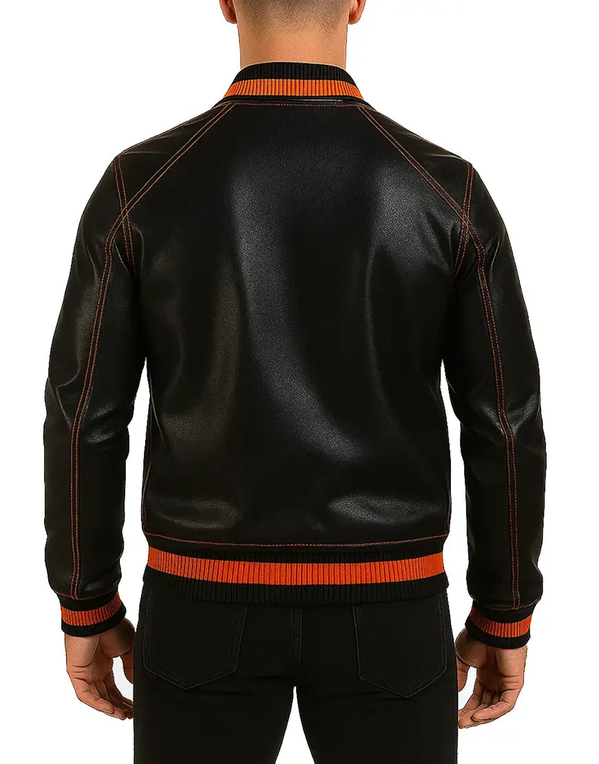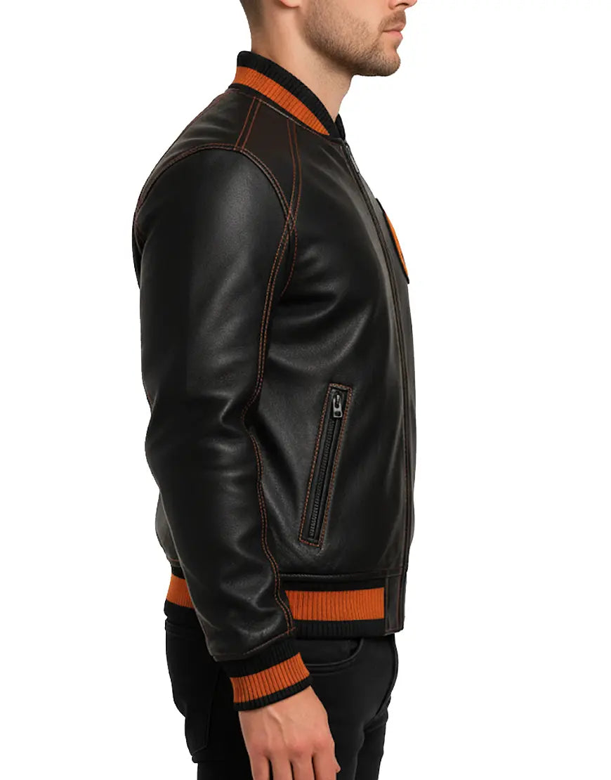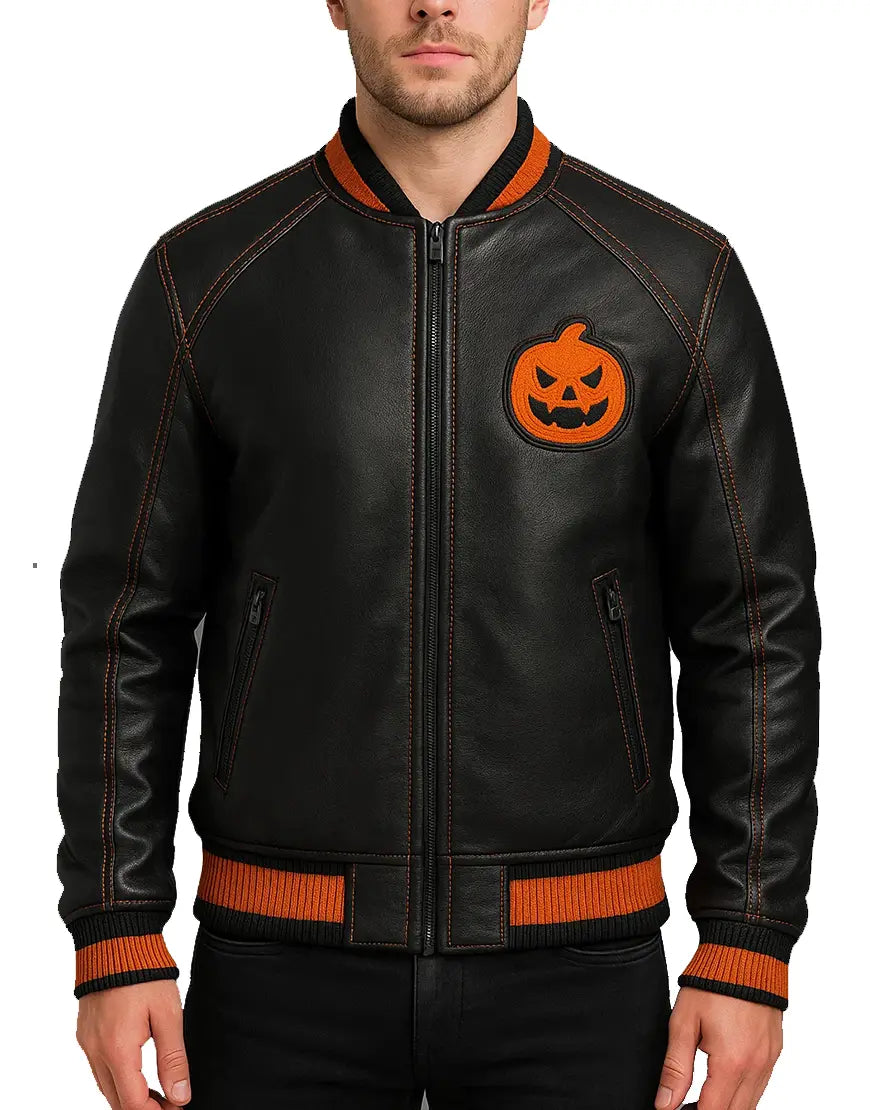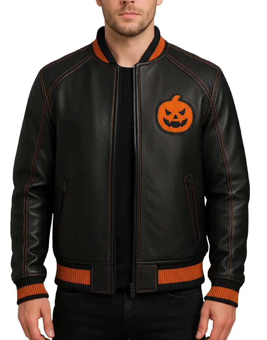 Step into bold seasonal style with this Black & Orange Halloween Bomber Jacket, a perfect fusion of modern streetwear and festive attitude. Crafted with premium-grade real leather, this jacket delivers a sleek matte finish enhanced by eye-catching orange rib-knit hems, cuffs, and collar. The standout pumpkin embroidery on the chest adds a vibrant Halloween vibe without overpowering the jacket’s clean, structured silhouette, making it ideal for October events, themed parties, or edgy year-round wear. Designed for comfort and durability, this bomber features smooth zipper closure, reinforced panel stitching, and soft inner lining for all-day ease. Functional side pockets offer practicality, while contrasting orange stitching elevates the overall design. Whether you're pairing it with black jeans or styling it for a Halloween event, this jacket guarantees a unique, confident, and season-ready look.
