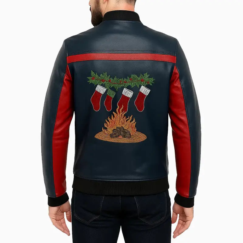 Men's Bomber Leather Jacket With Christmas Embroidered Patch