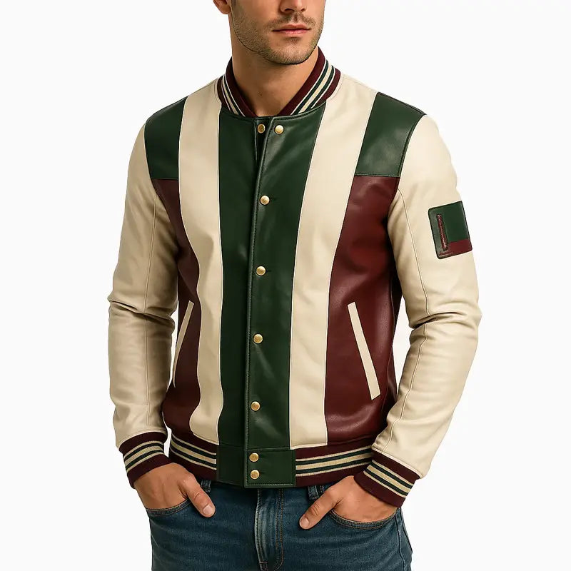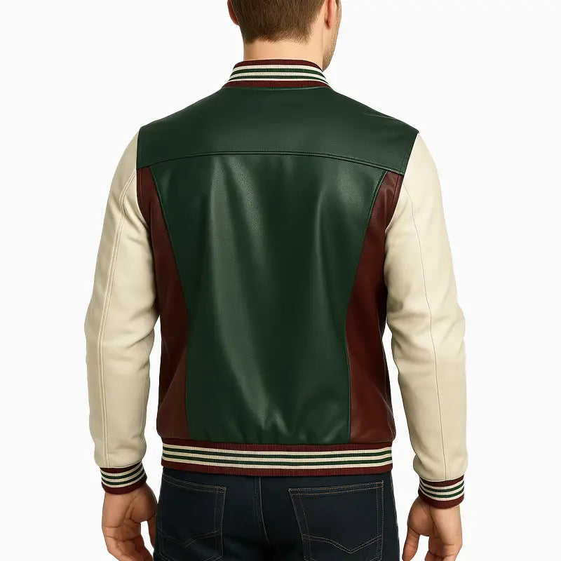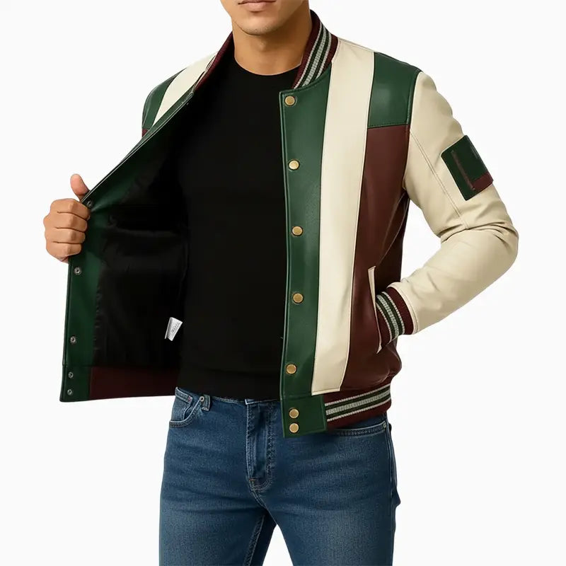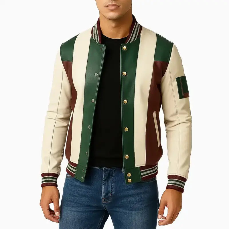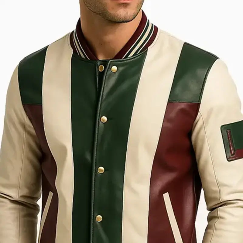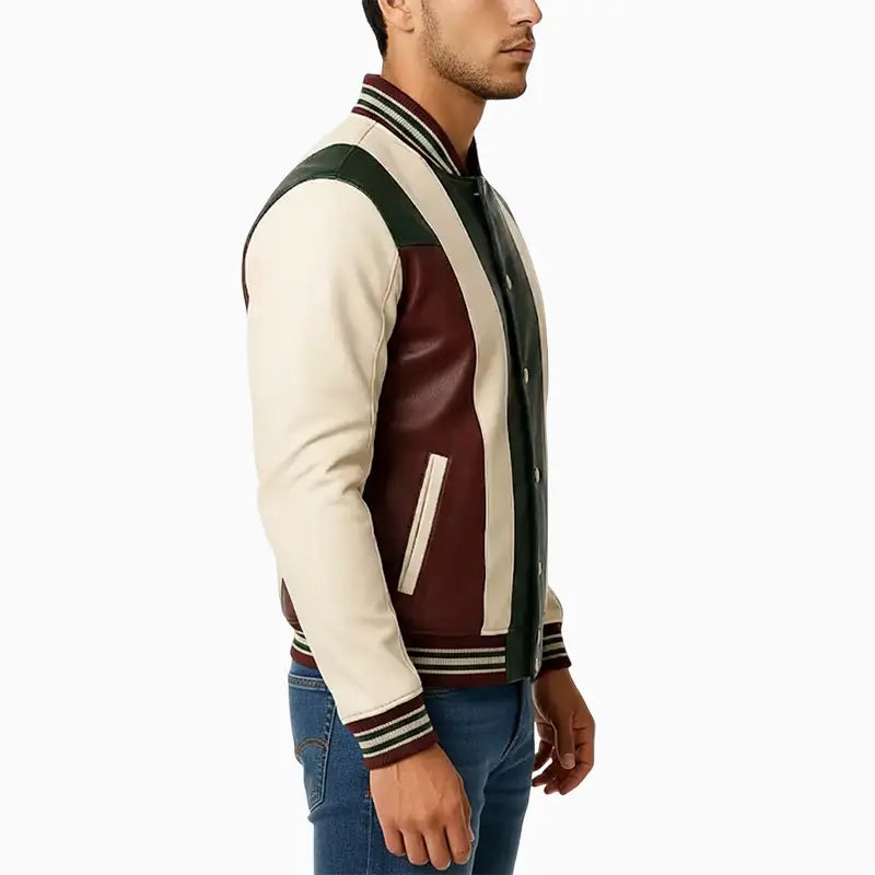 This varsity-style jacket showcases an eye-catching combination of rich green, creamy white, and deep maroon leather panels, making it a unique addition to your daily wardrobe. Its sharp color blocking and superior craftsmanship provide a sophisticated touch, allowing for seamless coordination with both casual and semi-casual attire. Engineered for both comfort and longevity, the jacket is equipped with plush ribbed edges, sleek snap closures, and a fitted silhouette that allows for easy movement. The tailored design and meticulous stitching contribute to its classic charm, enhancing any clothing collection.
