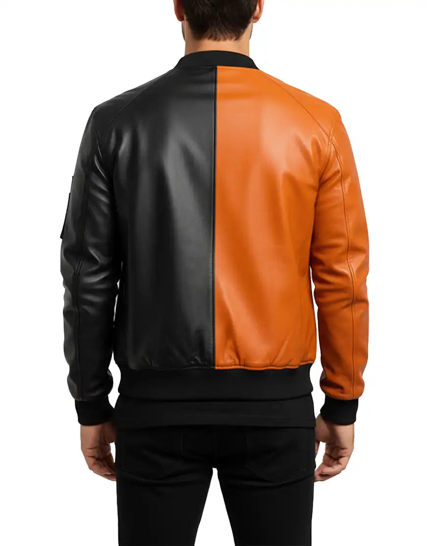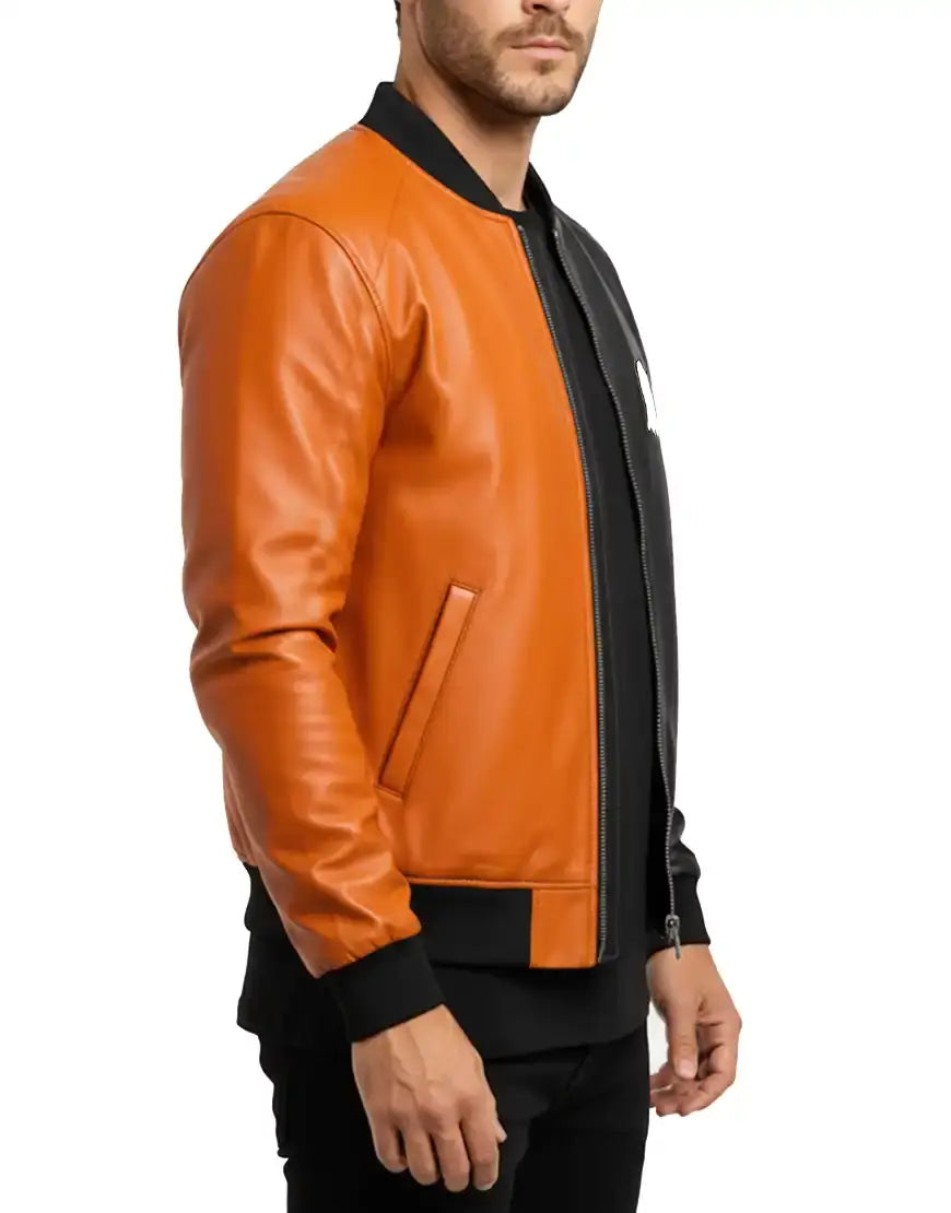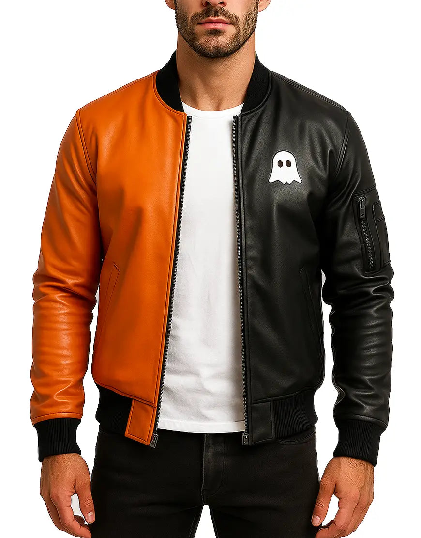 Mens Horror Embroidered Patch Orange And Black Bomber Leather Jacket