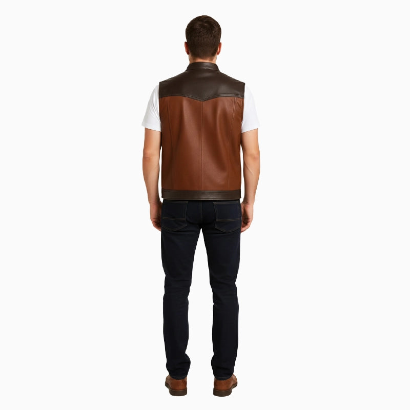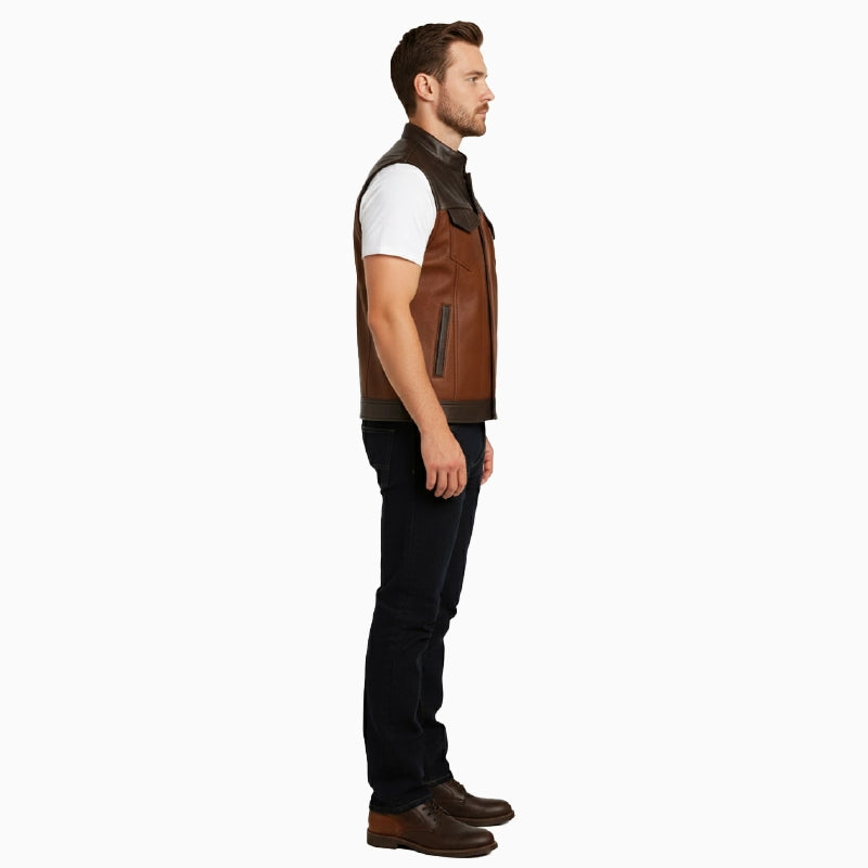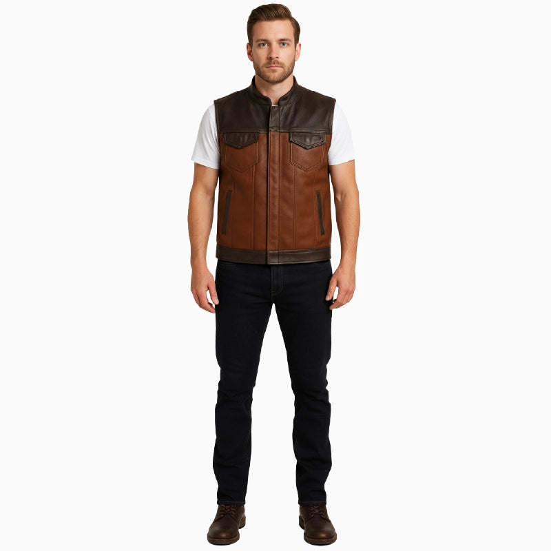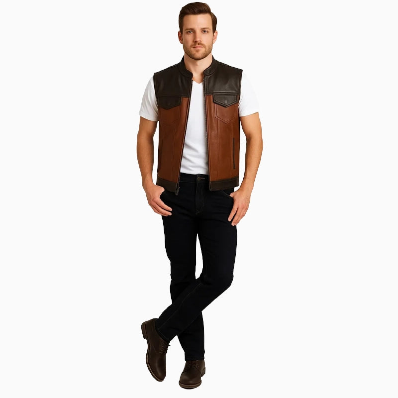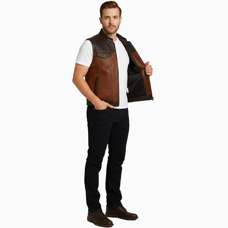 This Vintage Style Real Leather Brown Biker Vest For Men blends rugged Western character with modern urban styling. Designed with a striking dual-shade combination of dark chocolate brown and rich cognac, it delivers a bold look that’s perfect for layering over T-shirts, hoodies, or casual shirts. The structured silhouette and premium stitching add durability while keeping the vest stylish and comfortable. Whether you're riding, traveling, or dressing for a casual night out, this leather vest provides the ideal balance of toughness and versatility. With functional pockets, smooth front zipper closure, and a clean collarless design, this piece becomes a long-lasting wardrobe essential you can rely on season after season.