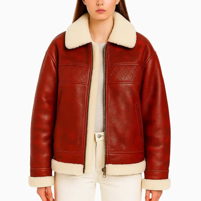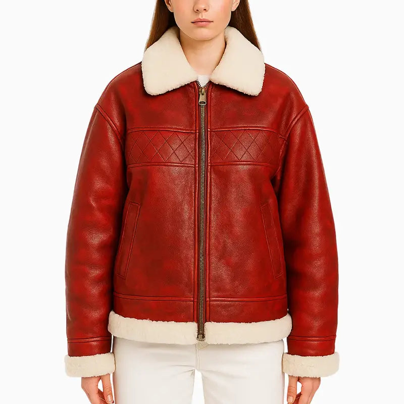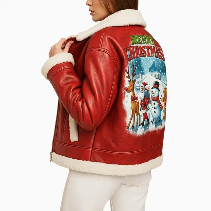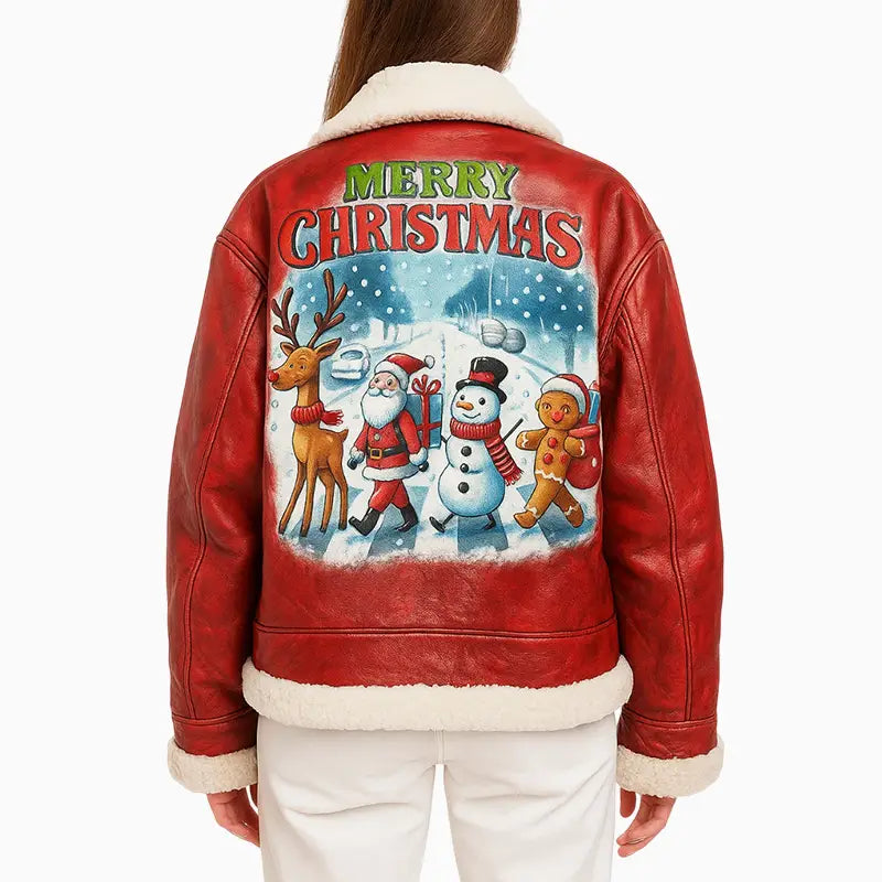 Step into the holiday spirit with this premium Friends Xmas Hand Painted Art Quilted Leather Jacket designed to blend warmth, comfort, and festive charm. Made from high-quality real leather, it features a soft shearling collar and trims that add both luxury and insulation, making it ideal for cold winter days. The rich red color provides an eye-catching base that instantly elevates any seasonal outfit. The highlight of this jacket is the beautifully hand-painted Christmas artwork on the back, showcasing Santa, a reindeer, a snowman, and a gingerbread character walking through a snowy winter scene. Every stroke is crafted with attention to detail, creating a cheerful and heartwarming design perfect for holiday celebrations, events, or gifting. Stylish, warm, and festive — this jacket is a must-have for the season.
