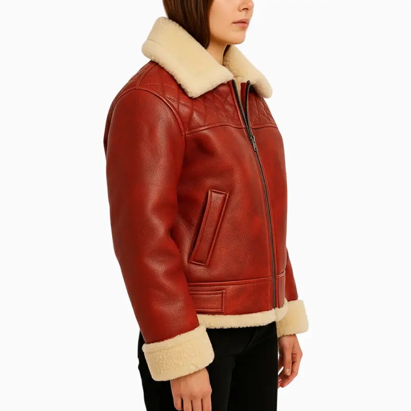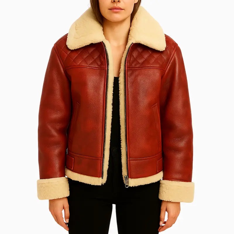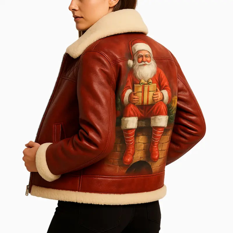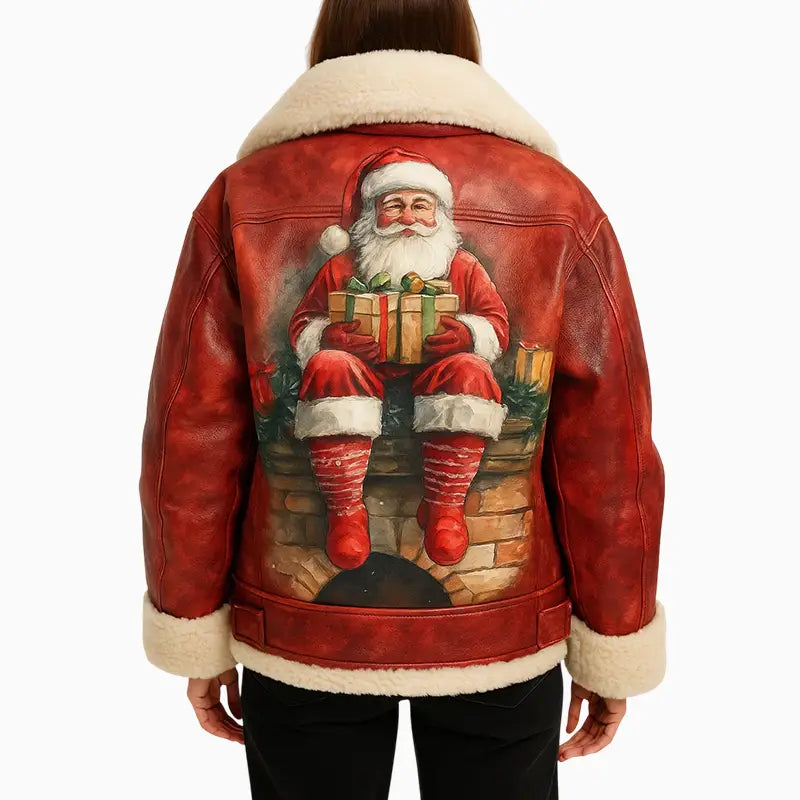 Red Quilted Shearling Leather Jacket with Hand Painted Santa