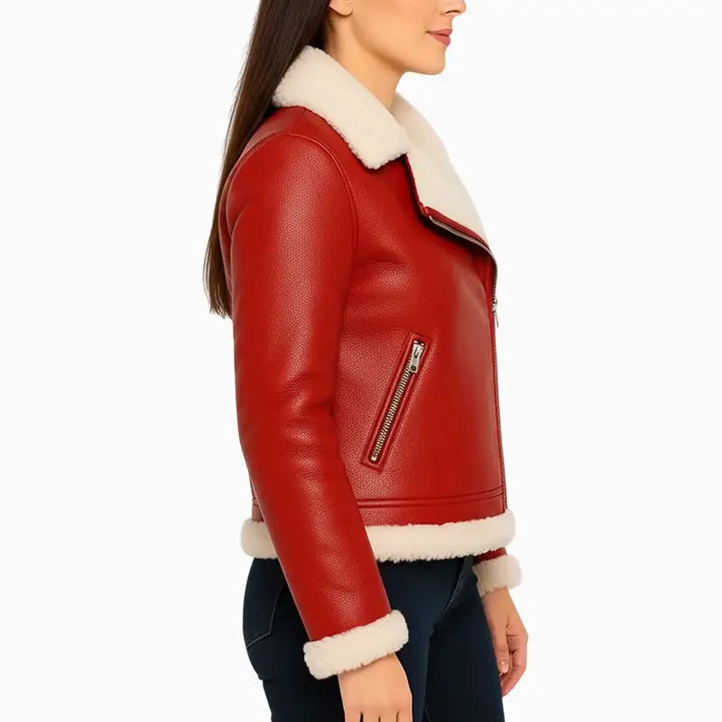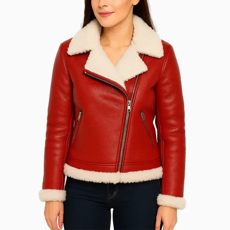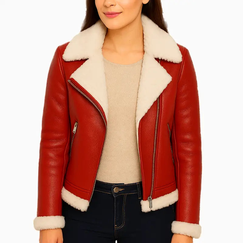 Santa and Reindeer Xmas Red Asymmetrical Shearling Leather Jacket