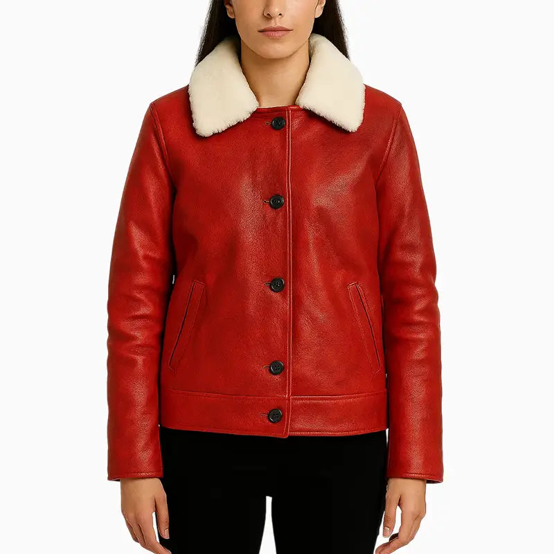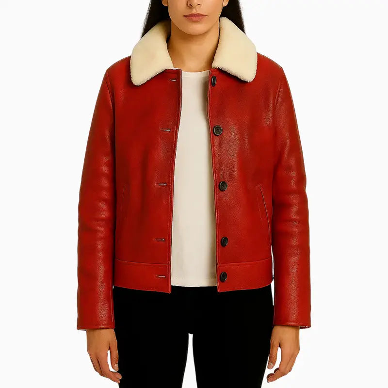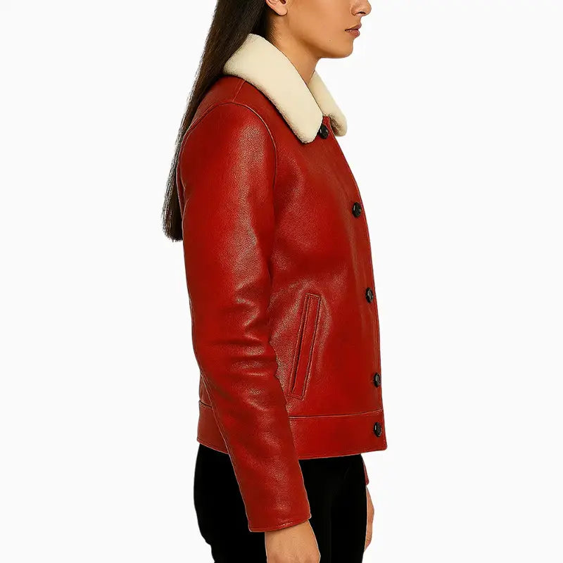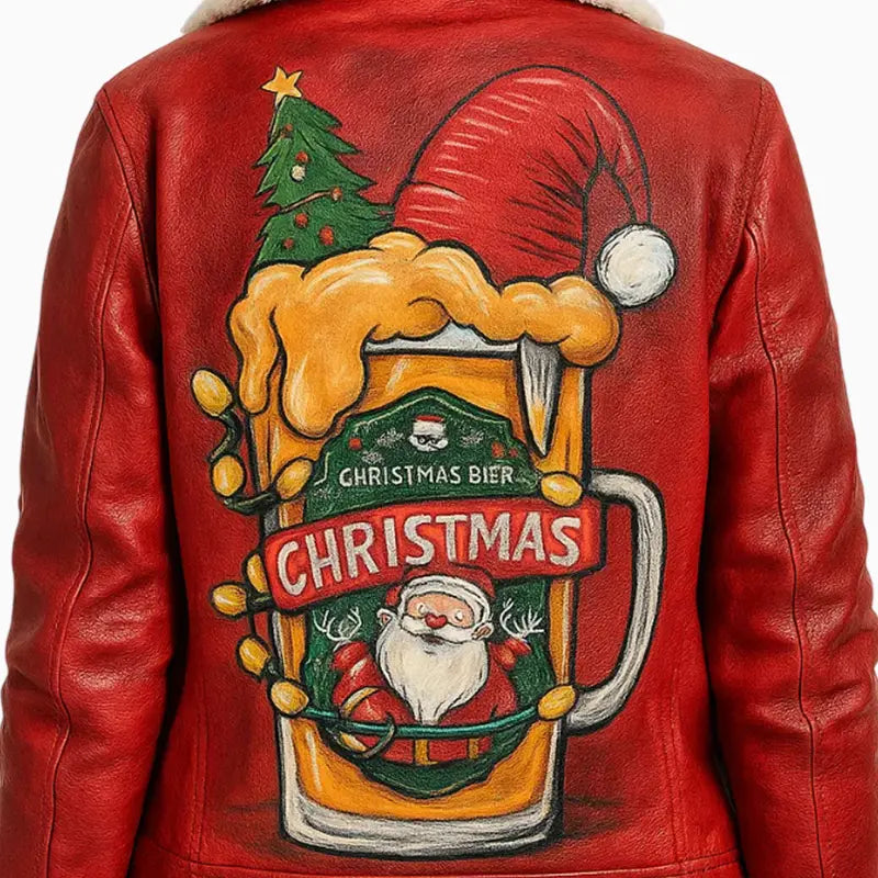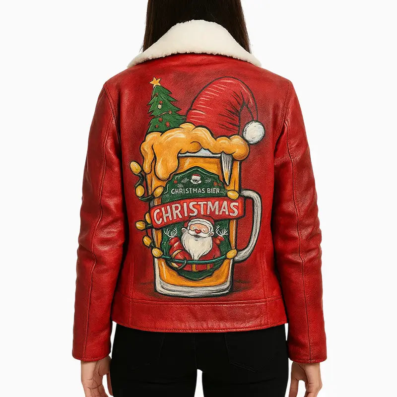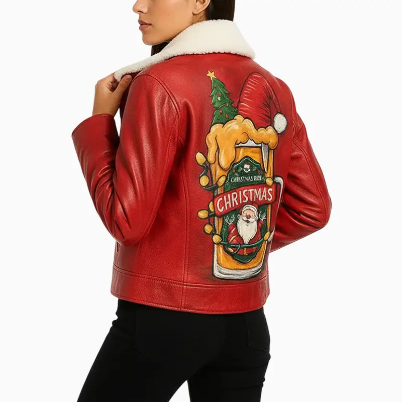 Women Red Leather Jacket with Chilled Beer Hand Painted Art