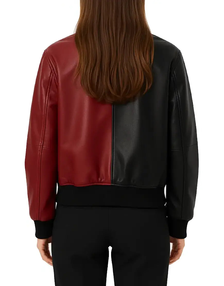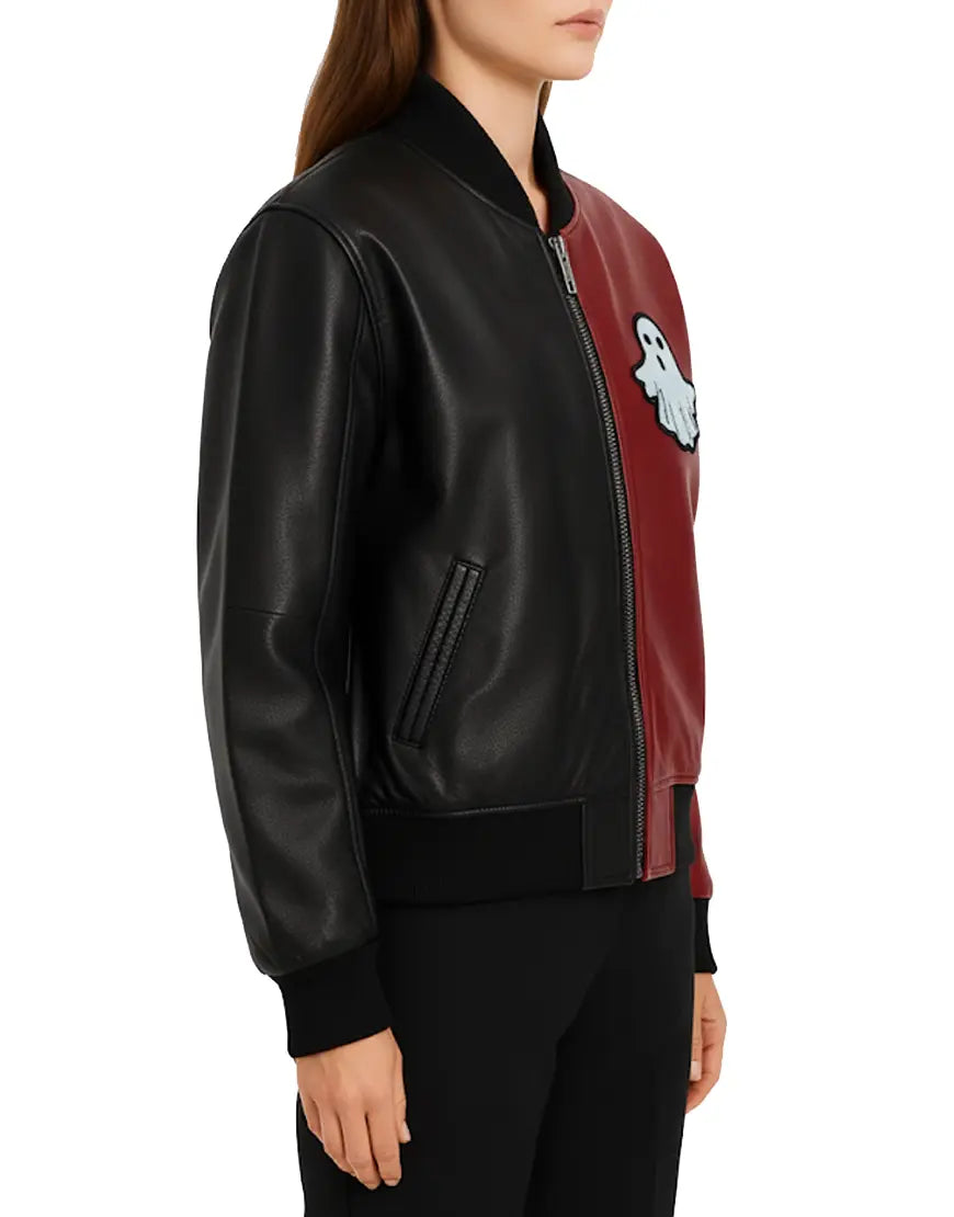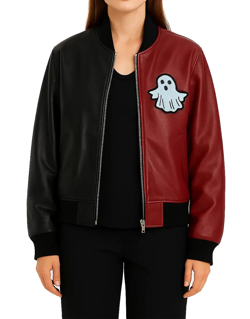 This women’s black and red leather bomber jacket brings a bold two-tone design perfect for anyone who loves standout style. The split-color front creates a strong visual contrast, enhanced by the playful ghost patch on the chest that adds a fun, expressive touch. Made from premium leather, the jacket maintains a smooth finish and structured shape, making it stylish enough for everyday wear while still delivering personality. The rib-knit collar, cuffs, and hem provide a classic bomber fit, ensuring comfort and warmth throughout the season. The smooth zipper closure and angled side pockets make it practical without sacrificing its sleek, modern look. Whether worn casually or as part of a themed outfit, this jacket is the perfect blend of trendy, edgy, and effortlessly cool.