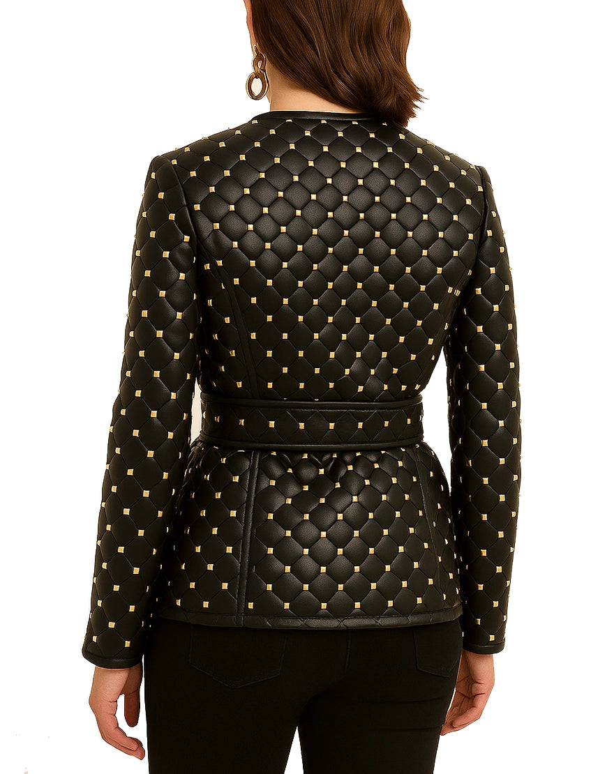 Elevate your wardrobe with this luxurious Women’s Gold Studded Leather Jacket, crafted to deliver style, sophistication, and bold confidence. Featuring a premium quilted texture decorated with gold-tone studs, this jacket adds instant glamour to any outfit. Whether you're heading to an evening event or adding an elevated touch to casual wear, this piece offers the perfect balance of elegance and edge.