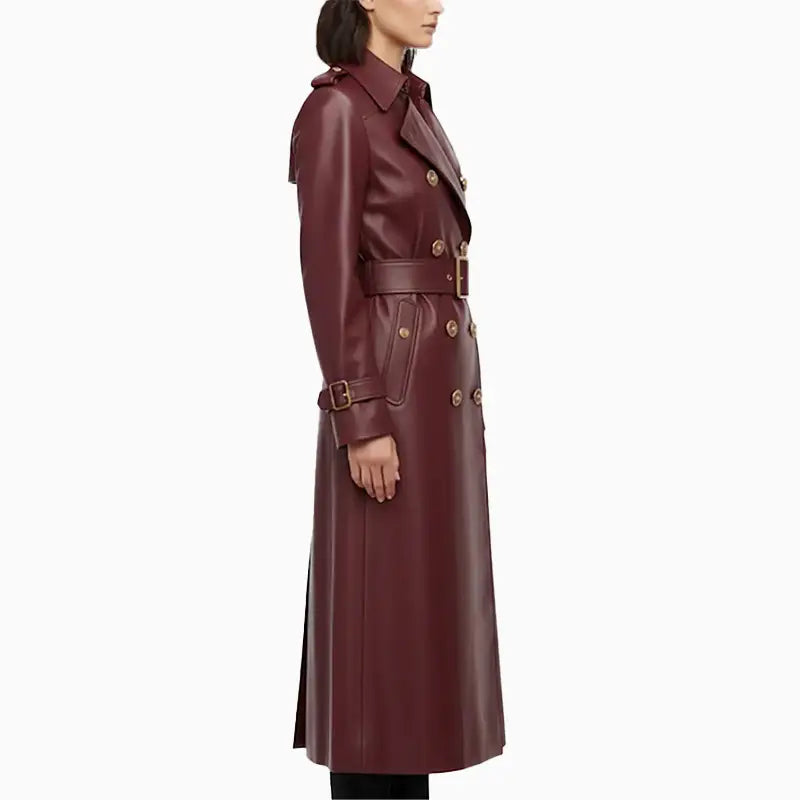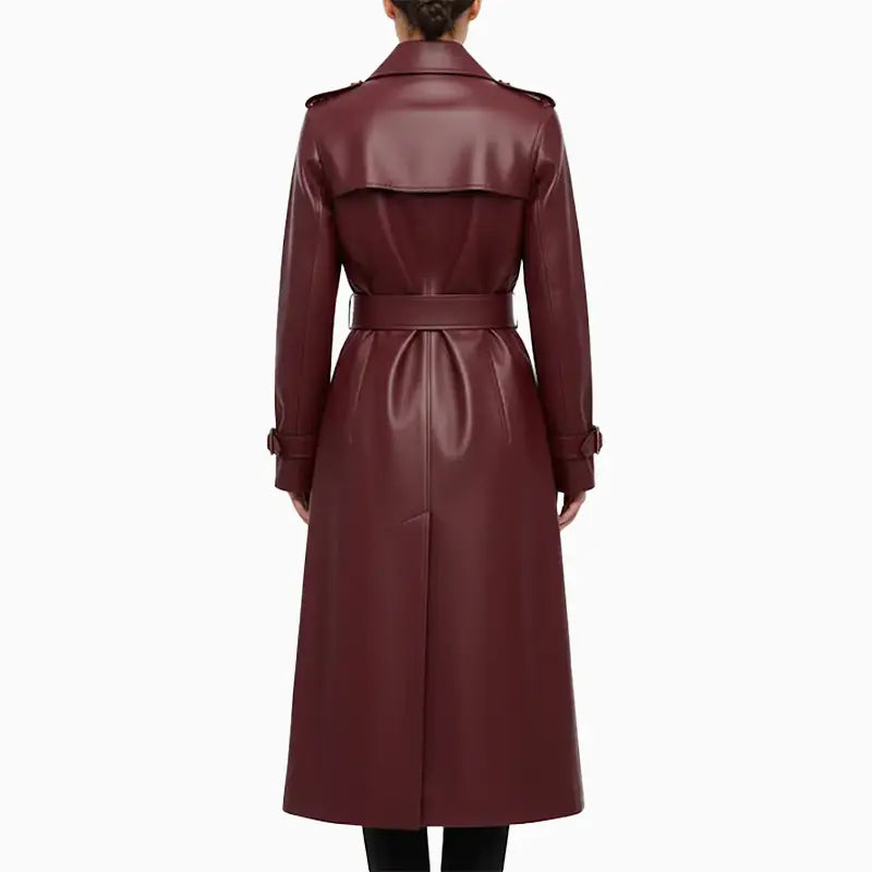 Burgundy Belt Leather Long Coat for Women
