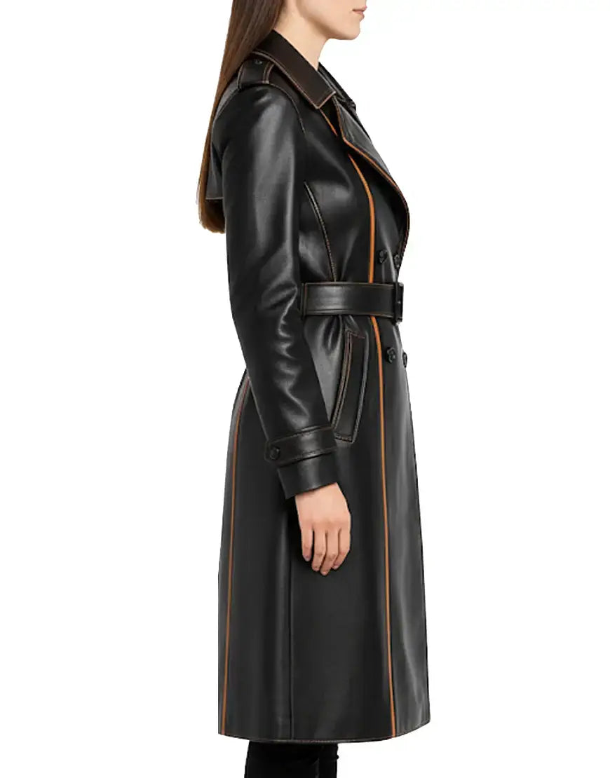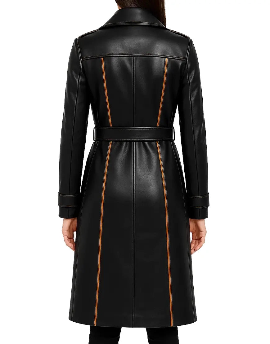 This women’s black leather trench coat delivers a striking blend of elegance and bold modern style. The long, structured silhouette is enhanced with vibrant orange contrast lines running vertically across the front and back, creating a strong, elongated look. Crafted from high-quality leather, the coat offers a smooth finish, sharp tailoring, and a timeless double-breasted front that elevates any winter or fall wardrobe. A matching leather belt cinches the waist for a refined, flattering fit, while the adjustable sleeve straps add both detail and practicality. The wide notch lapel collar, clean stitching, and polished button layout bring sophistication to the entire design. Whether worn casually or styled for an evening outing, this trench coat stands out as a luxurious, confident, and fashion-forward outerwear choice.