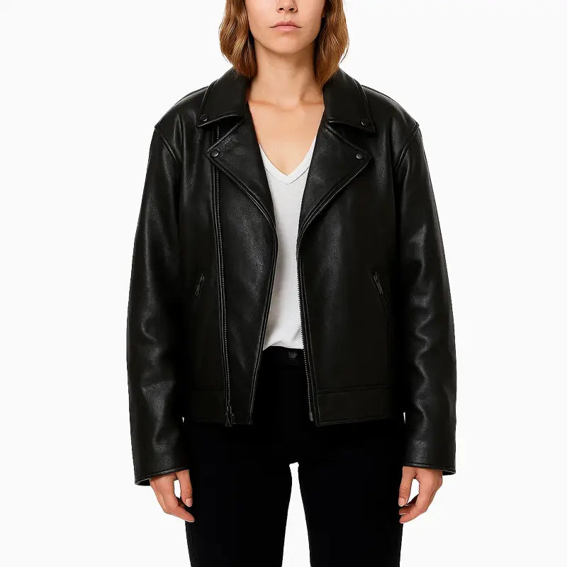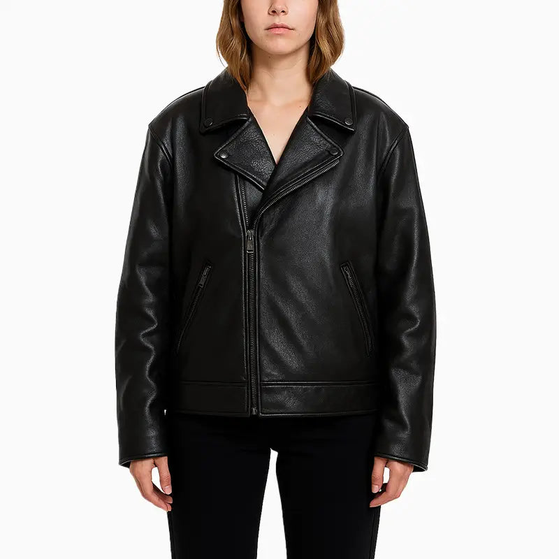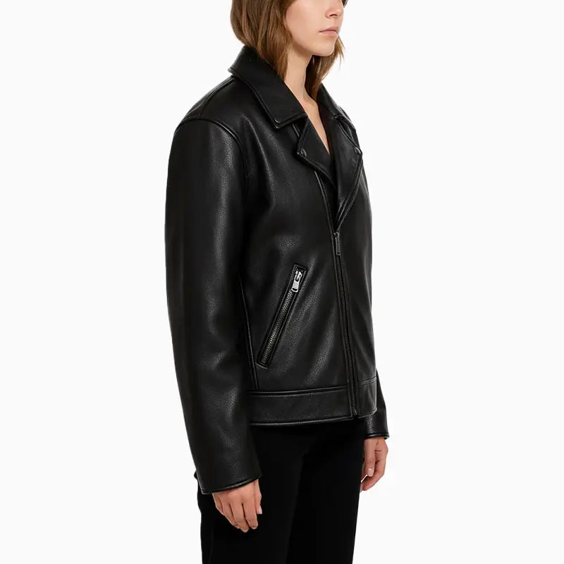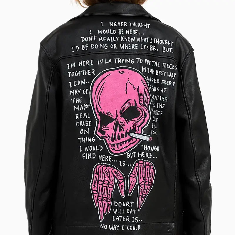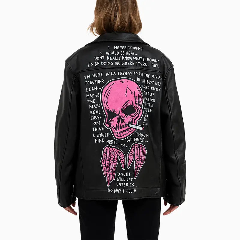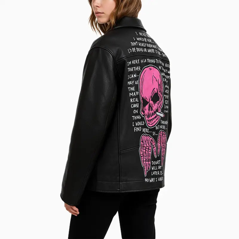 Asymmetrical Black Leather Jacket with Skull Art for Women