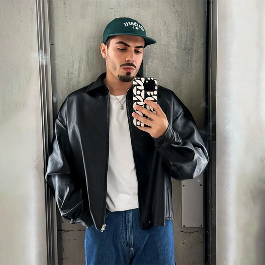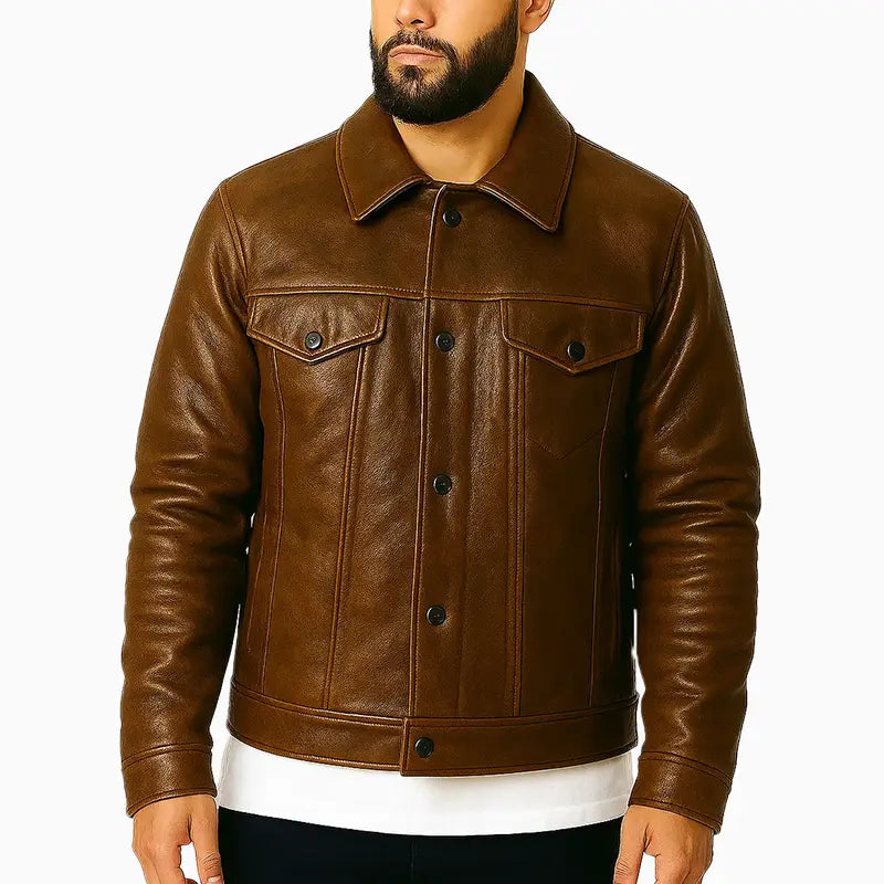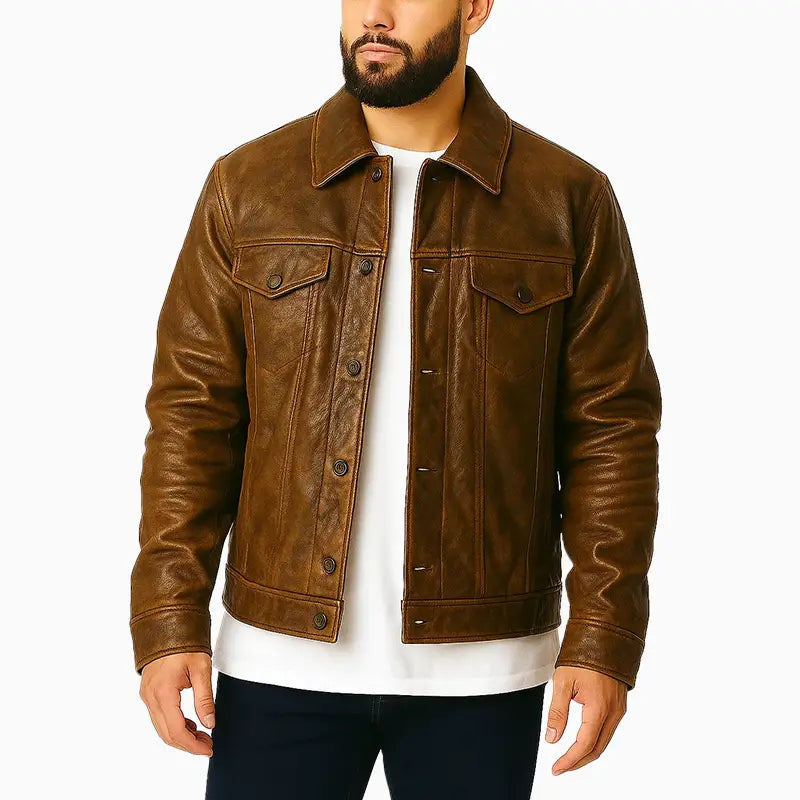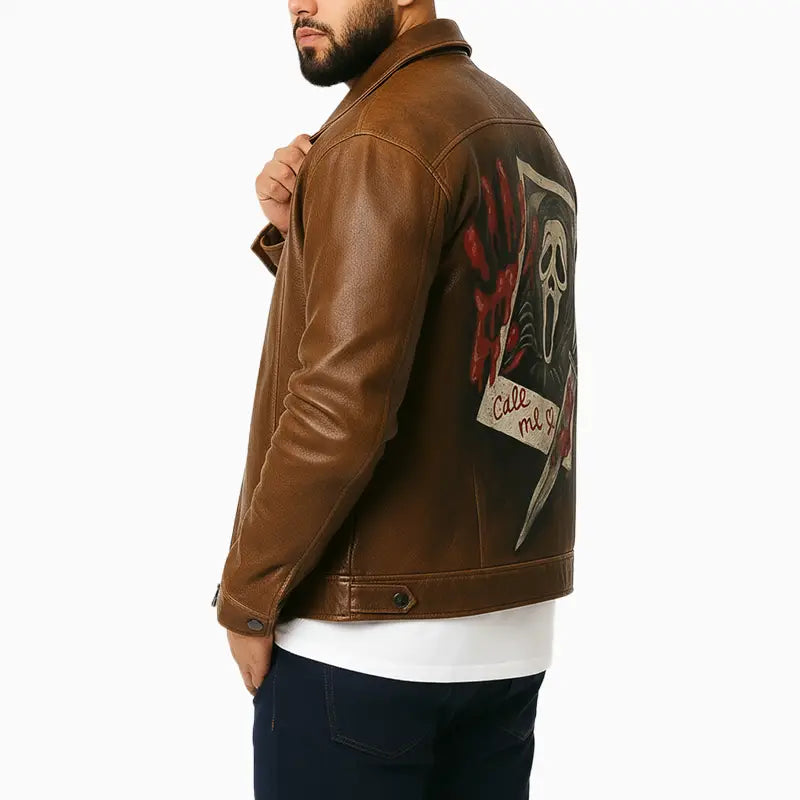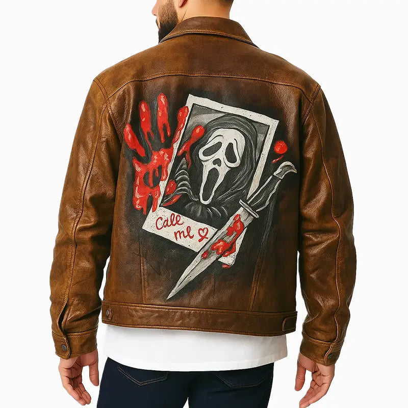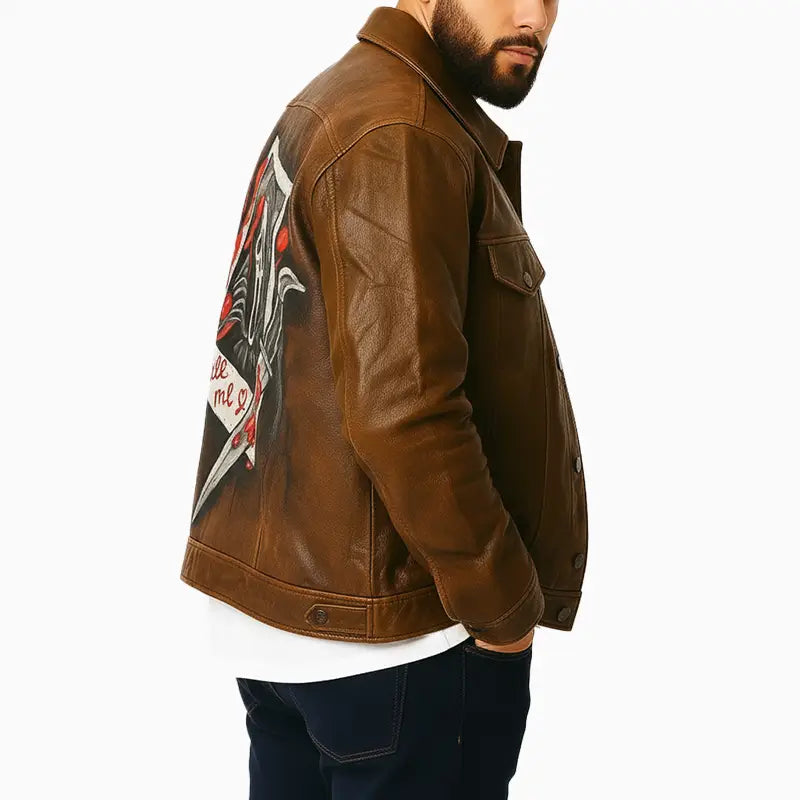 Dark Brown Trucker Scream Face Hand Painted Leather Jacket for Men